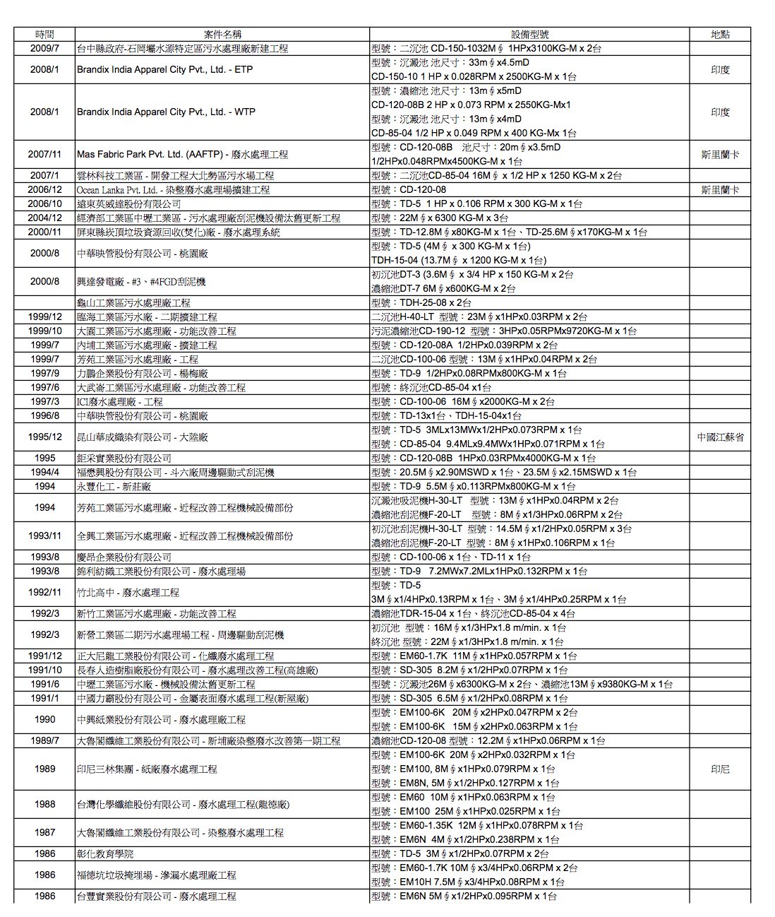 時間 案件名稱 設備型號 地點 2009/7 台中縣政府-石岡壩水源特定區污水處理廠新建工程 型號:二沉池 CD-150-1032M ∮ 1HPx3100KG-M x 2 台 2008/1 Brandix India Apparel City Pvt., Ltd. - ETP 型號:沉澱池 池尺寸: 33m ∮ x4.5mD 印度 CD-150-10 1 HP x 0.028RPM x 2500KG-M x 1 台 2008/1