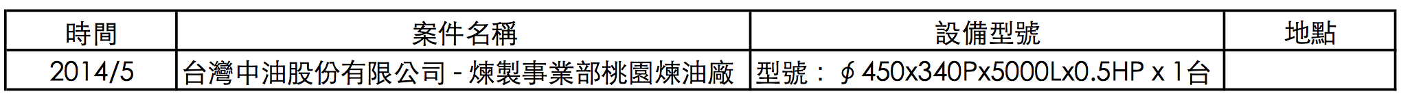 時間 案件名稱 設備型號 地點 2014/5 台灣中油股份有限公司 - 煉製事業部桃園煉油廠 型號:∮450x340Px5000Lx0.5HP x 1台