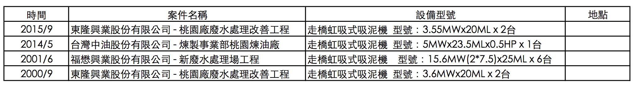 時間 案件名稱 設備型號 地點 2015/9 東隆興業股份有限公司 - 桃園廠廢水處理改善工程 走橋虹吸式吸泥機 型號:3.55MWx20ML x 2台 2014/5 台灣中油股份有限公司 - 煉製事業部桃園煉油廠 走橋虹吸式吸泥機 型號:5MWx23.5MLx0.5HP x 1台 2001/6 福懋興業股份有限公司 - 新廢水處理場工程 走橋虹吸式吸泥機 型號:15.6MW(2*7.5)x25ML x 6台 2000/9 東隆興業股份有限公司 - 桃園廠廢水處理改善工程 走橋虹吸式吸泥機 型號:3.6MWx20ML x 2台