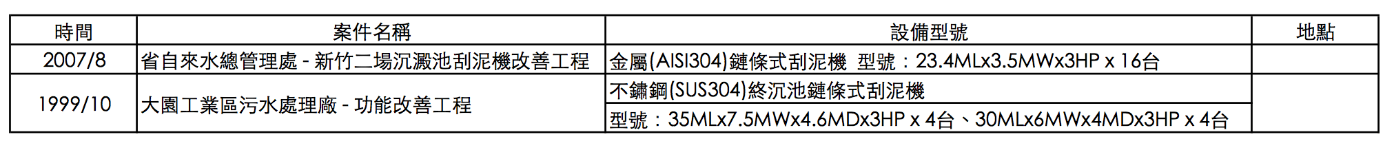 時間 案件名稱 設備型號 地點 2007/8 省自來水總管理處 - 新竹二場沉澱池刮泥機改善工程 金屬(AISI304)鏈條式刮泥機 型號:23.4MLx3.5MWx3HP x 16台 1999/10 大園工業區污水處理廠 - 功能改善工程 不鏽鋼(SUS304)終沉池鏈條式刮泥機 型號:35MLx7.5MWx4.6MDx3HP x 4台